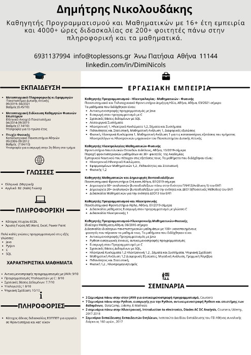 Είμαι πάρα πολύ έμπειρος καθηγητής Πληροφορικής και Μαθηματικών. Έχω διδάξει από το 2009, πάνω από 200 φοιτητές πάνω σε μαθήματα Πληροφορικής και Μαθηματικών. Έχω συμπληρώσει 4000 και πλέον ώρες διδασκαλίας πάνω σε αυτά τα αντικείμενα. Μπορώ να βοηθήσω υπεύθυνα φοιτητές πάνω στα εξής μαθήματα Πληροφορικής: Επιστήμη των Δεδομένων, Τεχνητή Νοημοσύνη, Python, Εισαγωγή στον Προγραμματισμό με Python, Μηχανική Μάθηση, Νευρωνικά Δίκτυα, Βαθιά Μάθηση, Αντικειμενοστραφής Προγραμματισμός, Java, C++, Εισαγωγή στον Προγραμματισμό με C, Λειτουργικά Συστήματα, Βάσεις Δεδομένων με SQL. Από Μαθηματικά μπορώ να διδάξω: Ανάλυση 1, 2, Διαφορικές Εξισώσεις (Συνήθεις και Μερικές), Μιγαδική Ανάλυση, Πιθανότητες, Στατιστική, Γραμμική Άλγεβρα, Αριθμητική Ανάλυση.